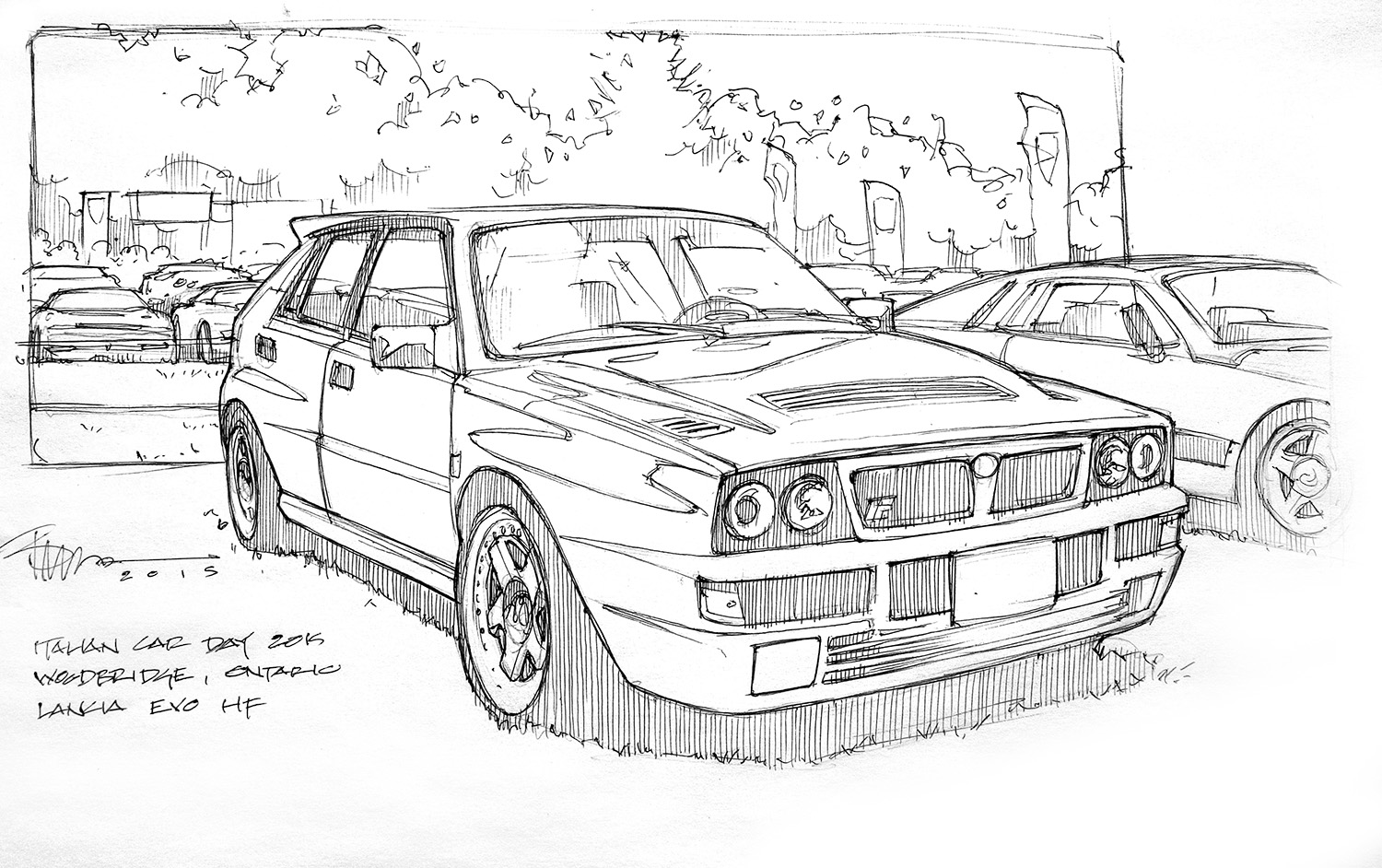 Another car from Italian car day. I think I’ve met this bloke before, at “Cars and Coffee” (there can’t be that many red Lancia Evo HFs around Toronto…), but I didn’t see him at Italian car day – just the car. Looked even better sitting on the grass, beside a bronze Lancia Beta Monte Carlo with a couple of Ferrari 308s behind…