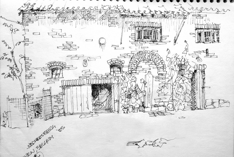 I remember staying in this Youth Hostel back in early July of 1985 – I’ve said that it is in “Leuven” – but it was not – it was rural, definitely outside of Leuven. Why is this amusing to me? My sister-in-law and her family live in Leuven and thus we are frequent visitors there. I had completely forgotten about this place, but have tried (since re-acquainting myself with this sketchbook) through various searches and search methods to see if I could locate this youth hostel/farmhouse but I have not been successful; Leuven has grown, I have no idea of how close (or far) this is from Leuven or indeed, what direction it was in relation to the city, and of course, it is almost certain that this place is no longer a hostel.