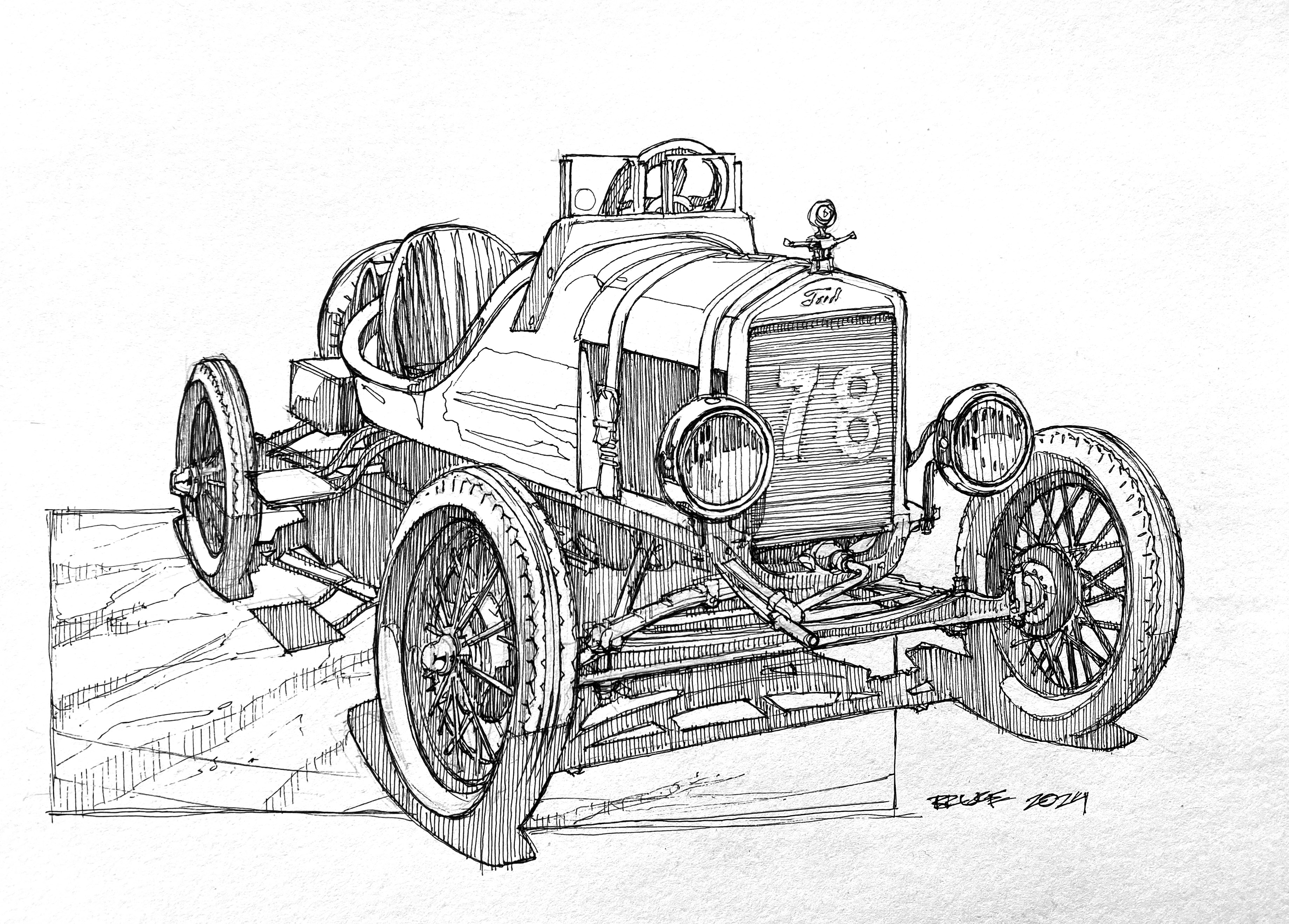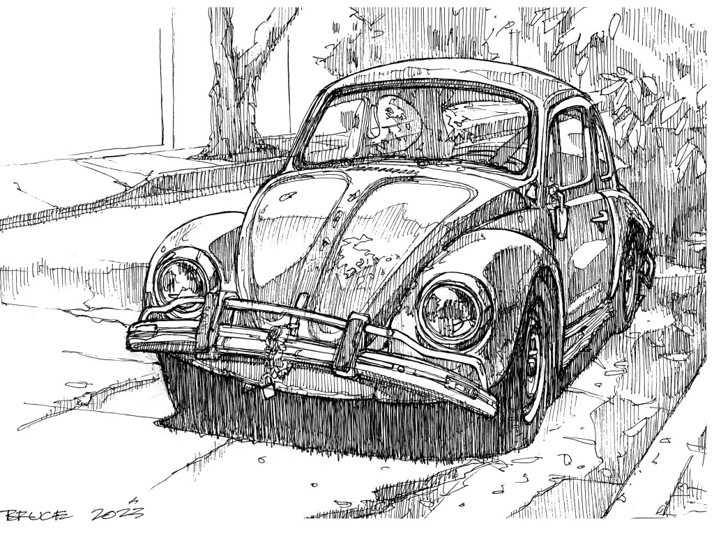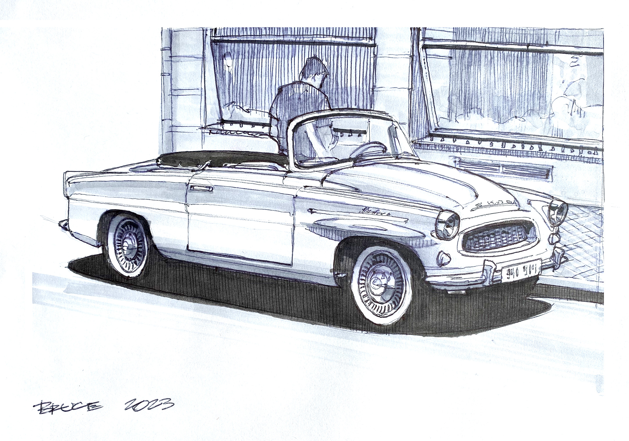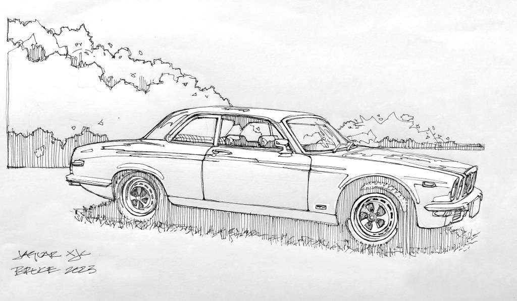 Evelyn and I saw this drive by on Lakeshore Blvd. in Burlington a week or two ago, and then later, came across it in a driveway. I was pleased, as I’d been driving when I first passed and didn’t get a photo, but, that rectified I came home and sketched. Not sure what you would call this, Racer? Roadster? But quite the vehicle!